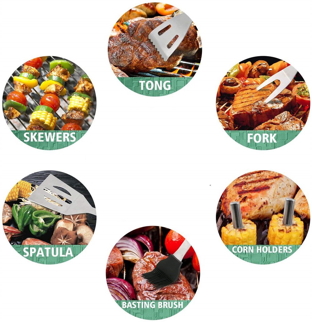 1.A Complete Frill Tools Set - BBQ spatula, barbecue power tong, barbecue fork, grill cleaning brush, silicone brush, 7 grill skewers, 8 corn holders, carrying bag.