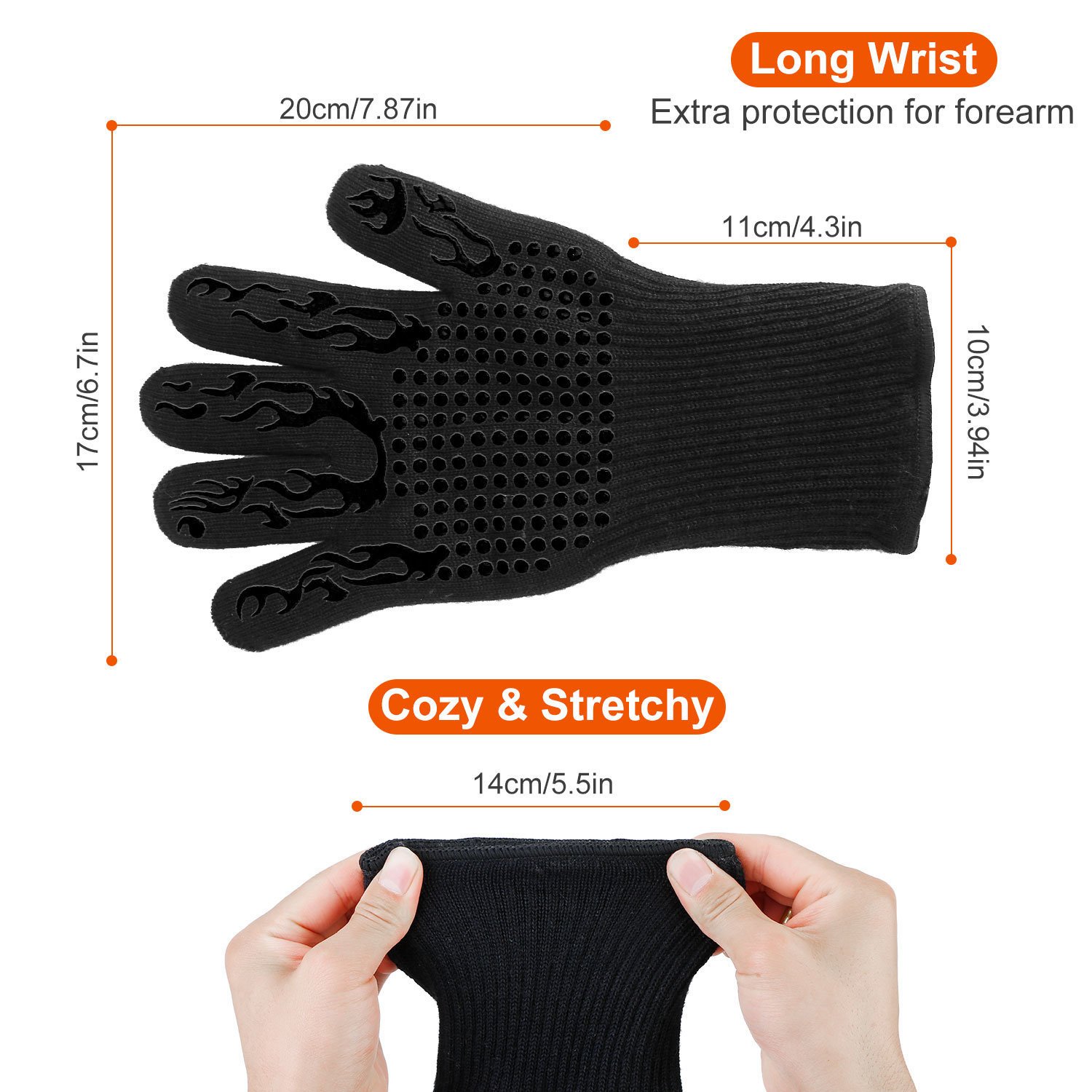 *Extended Wrist Protection*:The long cuffs of these gloves will protect your forearm and protect from burns when in deep grip in the oven; barbequing or other hot things.