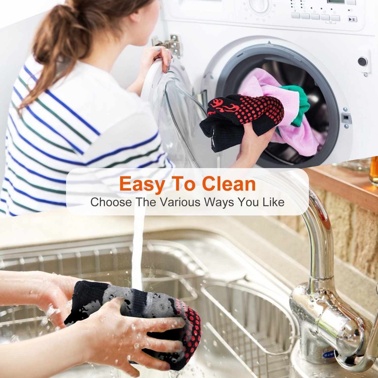 *Non-slip Silicone Surface*:Covered with food-grade dense anti-slip silicone on both sides; no need to worry about the baking pan would slip from hands!The oven gloves with separate fingers enable you comfortable and flexible; so you can hold different hot and slick kitchen items safely and stably.