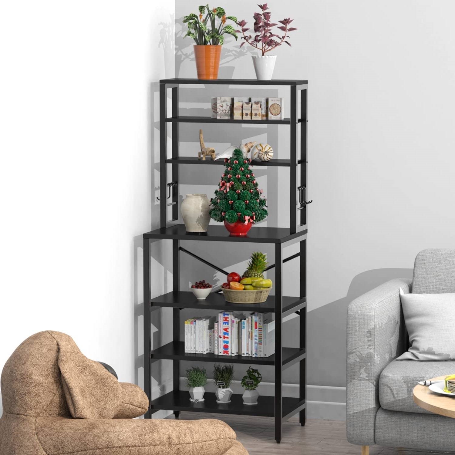 This Modern Black Metal Wood Kitchen Baker's Rack Shelf Microwave Stand provides enough space for storing a variety of everyday essentials, keeping your vegetables, fruit, microwave, cooking and eating utensils, plates and other kitchen accessories in plain sight and easy to access. 5 free S-shaped hooks are perfect for hanging kitchen towels and cooking spoons.It is your best choice for storage and saving space. This baker's rack is made of particleboard and iron bracket. The iron bracket is sturdy and durable, and the wooden board is waterproof and anti-friction. Also, its dimensions are 23.6 inches (length) x 15.7 inches (width) x 70.2 inches (height). Give your kitchen a refresh that’s as charming as it is practical; black give this kitchen shelf a unique look that you’ll want to show off during your next dinner party. This free standing backer rack not only can be used as a kitchen backer rack, but also can be used as an entryway storage shelf, spice rack and storage rack. We've got you covered anytime you have any issue regarding our product quality or any problem during use.