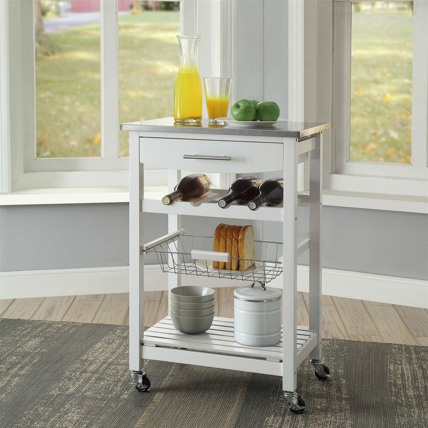 A stainless steel top makes this Stainless Steel Top White Wood Kitchen Island Storage Cart as chic as it is practical. Smart storage features include a wine rack, pull-out wire drawer, and slatted lower shelf. Use it as a handy addition to your kitchen or wheel this functional cart into the dining room for use as a bar cart. Customize by choosing from available finish options.