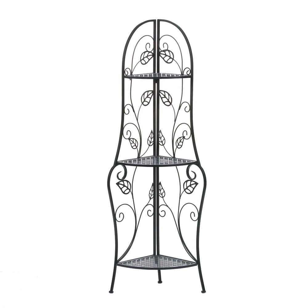 A sweet treat for any room, this Traditional Iron Corner Bakers Rack 3-Tier Plant Stand Kitchen Dining Shelf will display your plants, collectibles and more while enhancing your room with its pretty design. Trellis-inspired shelves climb up the curling metal frame that's decorated with lovely leaves. It will bring any dull corner to life!
